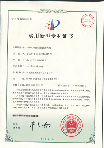 實用新型專利證書--一種太陽能采暖及熱水系統(tǒng)(2)