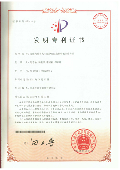 發(fā)明專利證書--內(nèi)聚光減容太陽能中高溫集熱管的制作方法